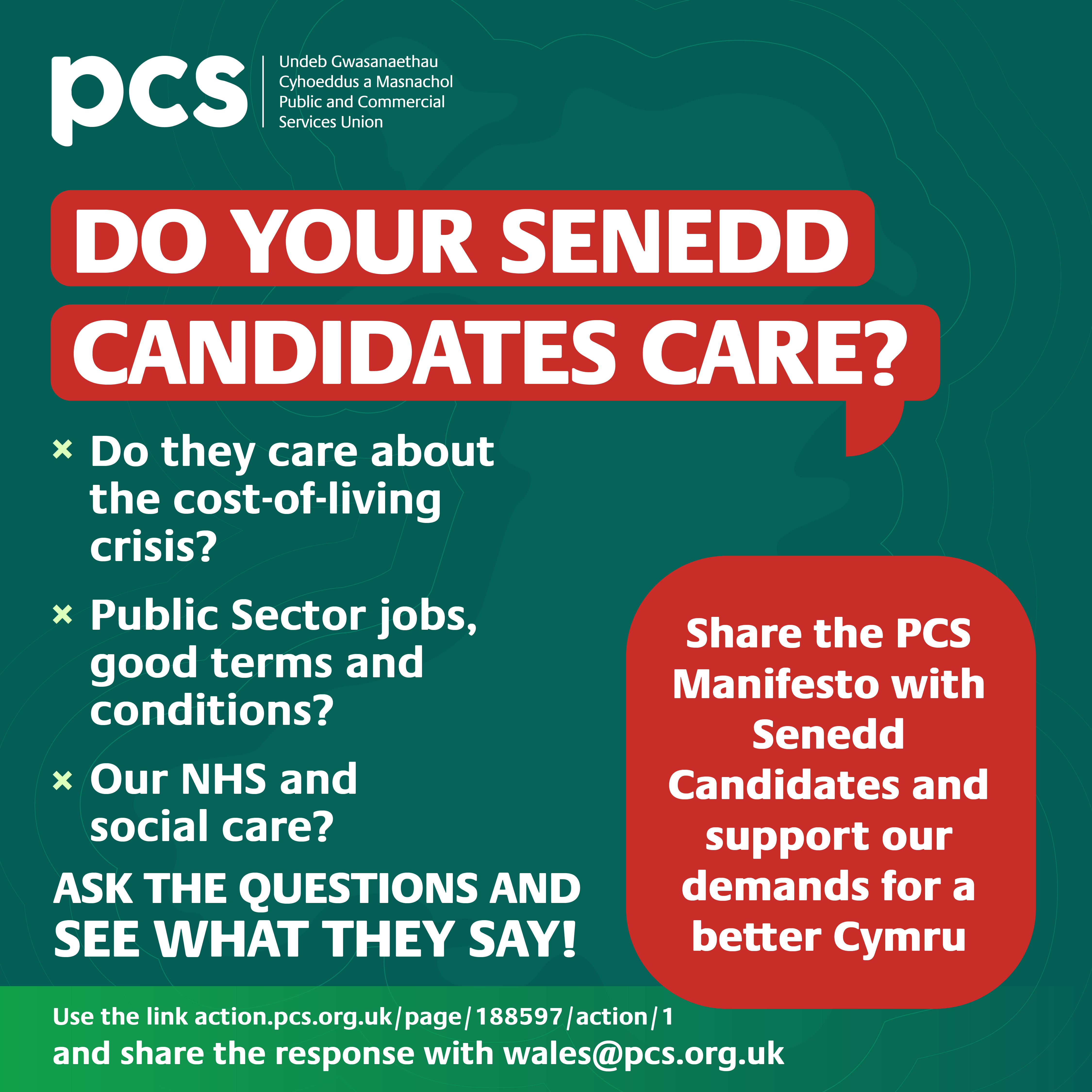 The Wales Executive Committee published a Senedd Election Manifesto in December, which sets out PCS’s key demands for prospective elected representatives, based on our democratically agreed policies. It is designed for you to use when engaging with candidates.